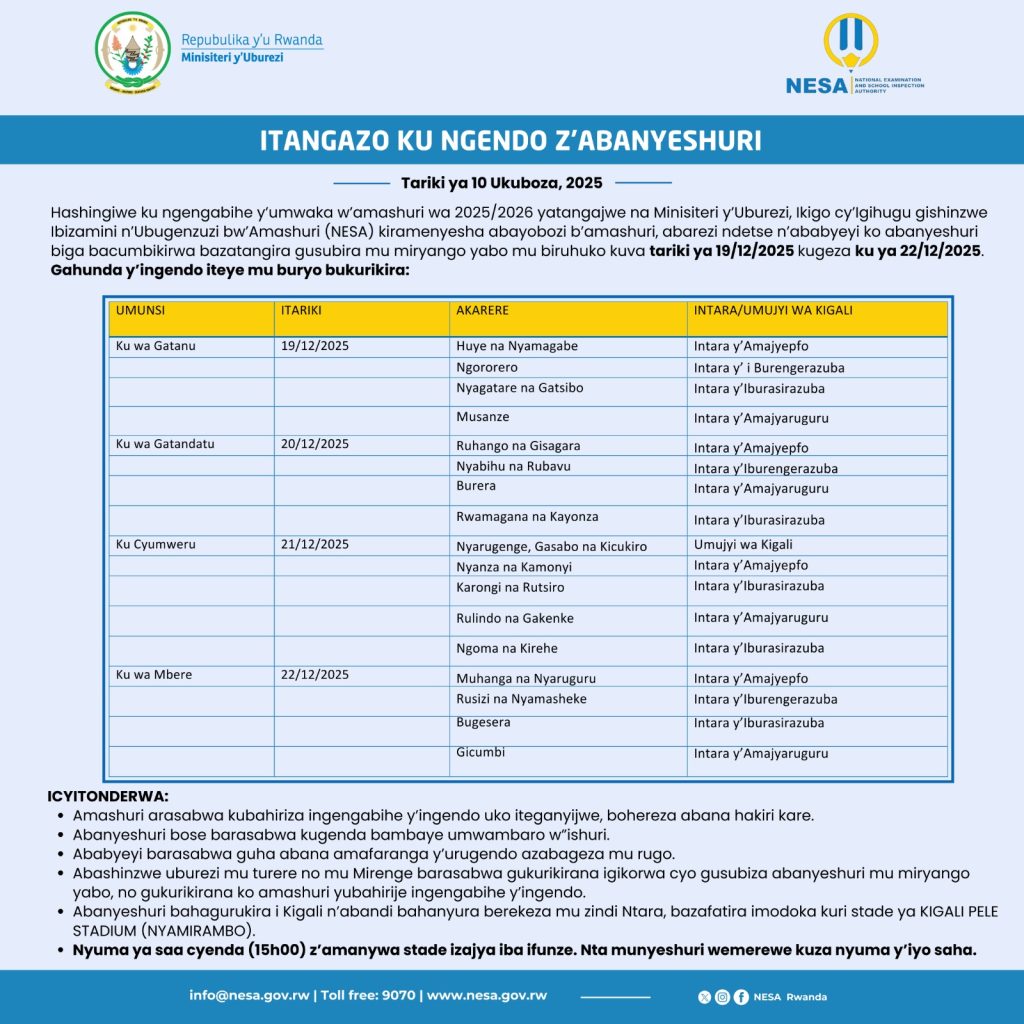 Minisiteri y’Uburezi (MINEDUC) n’Ikigo cy’Igihugu Gishinzwe Ibizamini n’Ubugenzuzi bw’Amashuri (NESA) batangaje gahunda y’ingendo z’abanyeshuri bazajya mu biruhuko by’Igihembwe cya mbere cy’umwaka wa’amashuri 2025-2026.